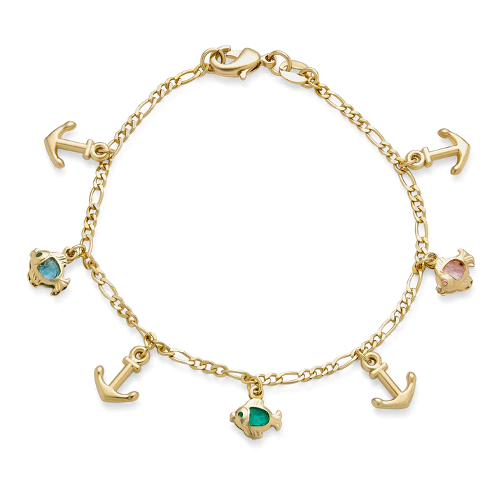 Recall blissful summer days by the beach with this enchanting, charm link bracelet. Dolphins symbolic of harmony and balance, nautical motifs featuring stars and crystal eye jewel tone of dolphins, poised ready to swim from a lustrous gold plated brass.