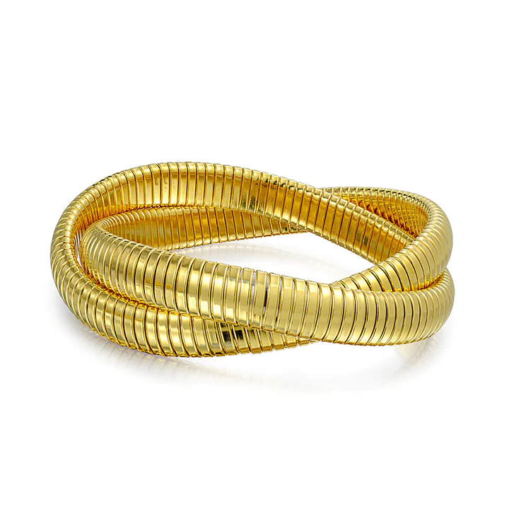 The flexible omega bands allows for a comfort fit, while the high polish finish adds a touch of elegance.
