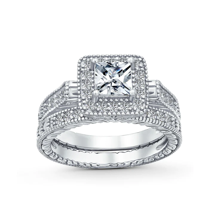 Inspire your beloved to fall more deeply in love with you with this enchanting, vintage style, wedding ring set. Includes engagement ring with darling, delicate princess cut, surrounded by cz’s.