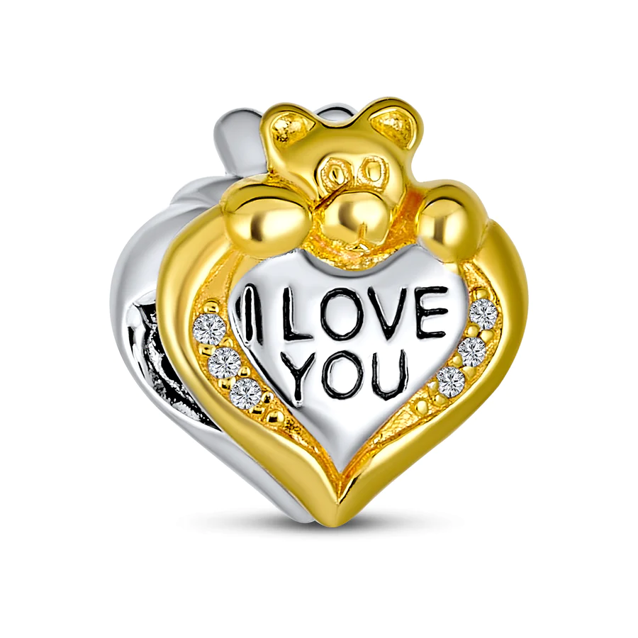 Show your love for someone with this heart shaped tri-colored, gold plated, oxidized sterling silver teddy bear charm and its CZ sides around its 5mm unthreaded core.