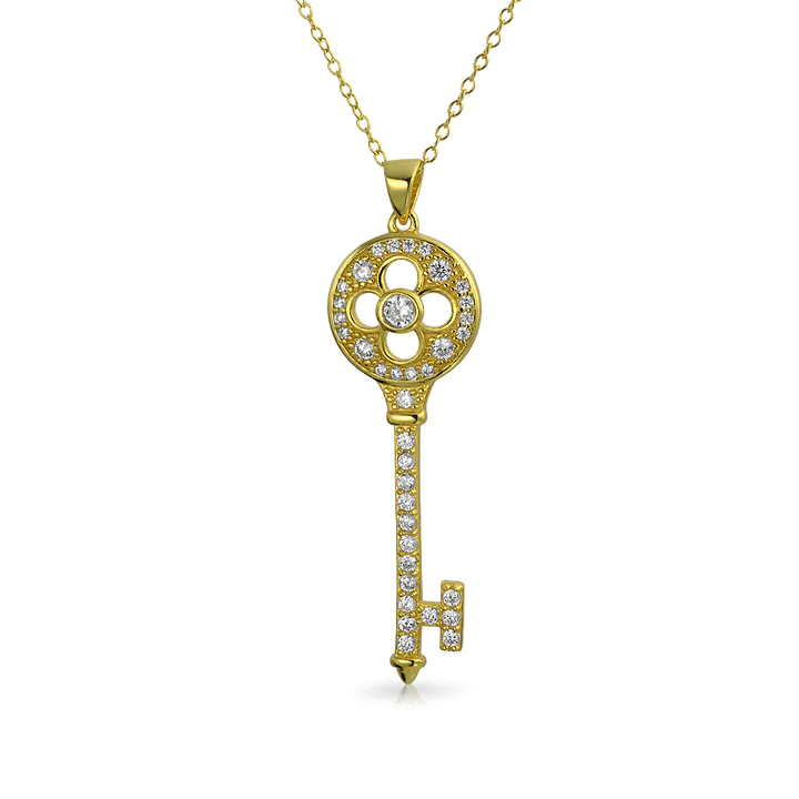 The key to a good outfit is choosing the right gold plated jewelry. It’s never been easier to unlock a better wardrobe with this 2in, pave CZ, clover inspired skeleton key pendant.